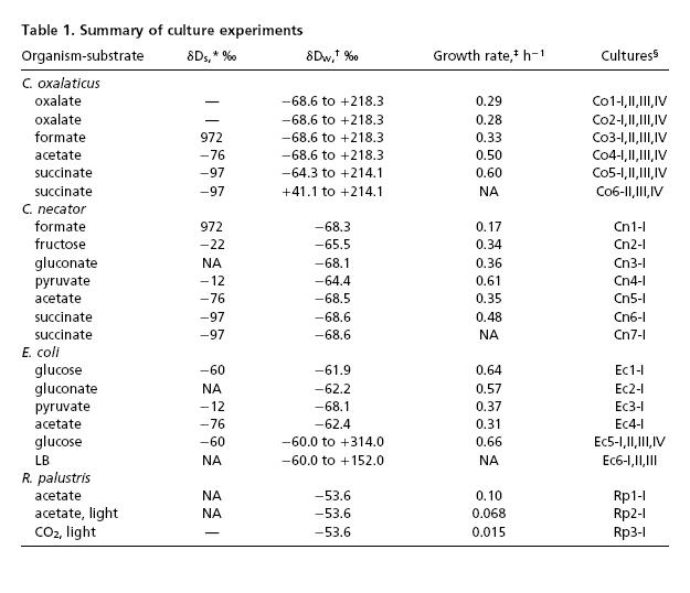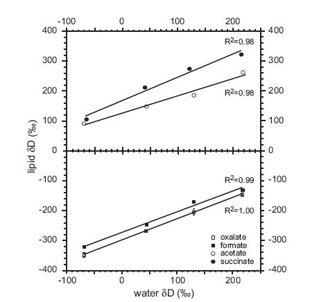 此前文献表明绝大多数生物中脂肪与水分之间存在比较大的D/H的分馏。这种分馏归结为同位素对脂肪生物合成的影响。本文我们报导了4种细菌(phylum Proteobacteria)的脂肪与水分之间的D/H分馏 ,结果表明单一生物之中波动可以达到500‰ 。这种变动不可能归因于脂肪生物合成,因为这些途径中没有明显的变化,也不能归因于培养基的D/H比率。更重要的是,脂肪/水的D/H随着新陈代谢而系统地变化:化学自养生长(几乎达到-200到-400‰)、光合自养生长的(-150到-250‰)、非自养生物,采用糖做培养基的生物(0到-150‰),以及非自养生物,采用TCA循环(-50到-200‰) 。我们猜测脂肪的D/H比率很大程度上是由生物合成的NADPH来控制,而不是脂肪生物合成途径本身来决定的。我们的结果表明,不同的代谢途径产生NADPH—并间接影响脂肪的同位素组成。如果是这样,脂肪的δD值可能成为连接脂肪和能量代谢的重要生物化学循环工具,并可通过固碳途径中13C提供了更多的补充信息。